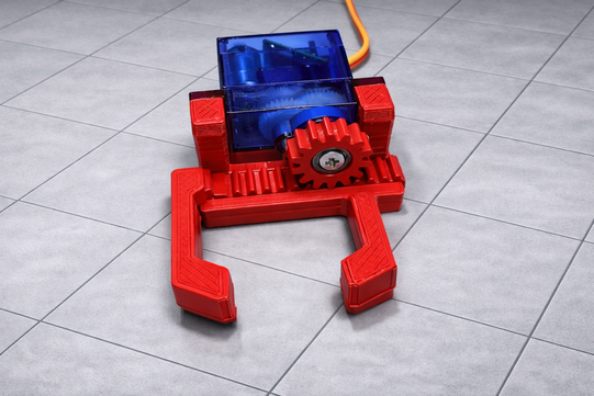 We will provide some 3d printed and electronic parts from which you can build your own gripper robot. We will use an Arduino Nano microcontroller to control the robot. The robot has a light barrier, which senses if there are new objects available to grip on one side of the robot. If an object is detected, the robot rotates its arm (see Fig. 1) towards the object and grab it with a gripper mechanism (Fig. 2). Then, the arm of the robot will rotate to its other side, where the object will be placed on a conveyor belt. With the Digital Twin, you will be able to see the current state of the robot at your computer and control it via a Graphical User Interface. We will use the software "Processing" for the coding of the Digital Twin.